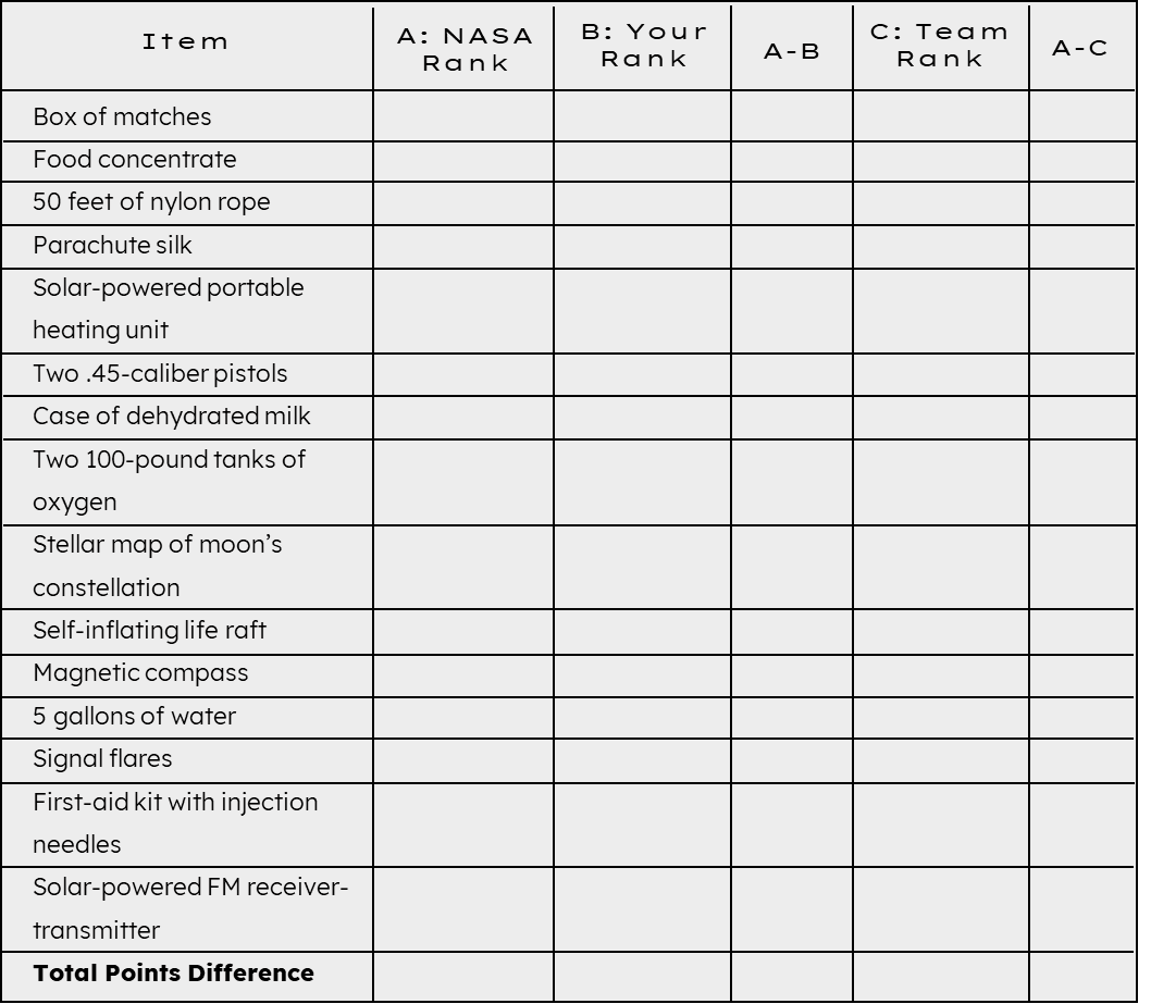 Your crew’s survival depends on reaching the mother ship, so you must choose the most critical items available for the 200-mile trip. Your task is to rank the 15 items in terms of their importance for survival. Place a 1 by the most important item, a 2 by the second-most important item, and so on through 15, the least important.